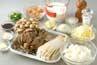 <キノコソース>のマイタケは2cm位の長さの小房にわけ、シメジは石づきを切り落とし、半分の長さに切り、根元はほぐす。エノキは根元を切り落とし、3等分の長さに切り、根元はほぐす。