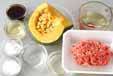 カボチャは種とワタを取り、大きめの一口大に切り、水洗いしぬれたまま耐熱容器に入れ、ラップをかけて4~5分電子レンジで加熱して、熱いうちに皮を取る。