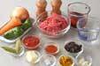 牛ひき肉を加えて色が変わるまでよく炒め、カレー粉を加えてさらに炒め合わせる。香りが立ってきたらレーズン、ケチャップ、チリソース、固形スープの素、ローリエ、赤ワイン、水を加えてひと混ぜする。