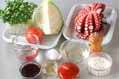 トマトはヘタをくり抜き、8つのくし切りにする。