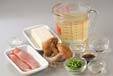 シイタケは石づきを切り落とし汚れを拭き取り、軸と笠に切り分け、軸は縦に裂き、笠は薄切りにする。