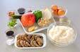 小さなボウルに1のエビを入れて2の炒めたチャーハンを入れて押さえつけ、器の中央に返して盛る。返したチャーハンの周りにキュウリ、リンゴを並べてチャーハンの山にショウガ、カシューナッツを掛ける。