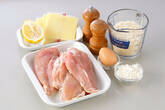 鶏肉に小麦粉、溶き卵、パン粉と<衣>をつける。