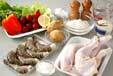 鶏肉、エビに小麦粉を薄くまぶす。鶏肉を<溶き衣>にくぐらせ、(1)の油に入れる。衣の表面が固まれば鶏肉を返し、10分くらいじっくり美味しそうな揚げ色が付くまで揚げ、取り出して油をきる。