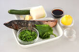 カツオのたたきを厚めに切り、大根、キュウリと共に器に盛り付ける。