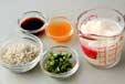 器に大根おろし、チリメンジャコ、刻みミツバを混ぜ合わせて盛り、<合わせじょうゆ>をかける。