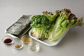 焼きのりはガス火で軽くあぶってパリッとさせ、食べやすい大きさにちぎっておく。