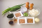 ツナのボウルに、納豆、プロセスチーズ、<調味料>を加えて混ぜ合わせる。
