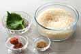 大葉は軸を切り落として縦半分に切り、細切りにして水に放ち、しっかり水気を絞る。