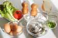 卵液に片栗粉をつけたカキ、玉ネギ、刻みネギを加えて混ぜ合わせる。