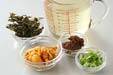 乾燥アオサは水で柔らかく戻してザルに上げ、水気を絞る。(干しワカメの場合は水で柔らかく戻して水気を絞り、長い場合はザク切りにする)