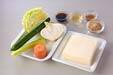器に豆腐をのせ、まわりに新玉ネギ、レタス、セロリ、キュウリ、ニンジンを盛り合わせる。
