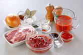鍋にサラダ油とニンニクを入れて火にかけ、香りが立てば、玉ネギを加える。全体に油がまわれば、豚肉を加えて更に炒める。