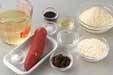 炊飯器にお米、<調味料>、分量の位置までのだし汁を加えてひと混ぜし、水気を切ったサツマイモを加え、普通に炊く。