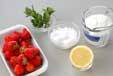 <イチゴソース>のイチゴは水洗いし水気を切る。ヘタを取り、大きい場合は2~4つに切る。