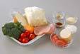 玉ネギ、ハムも加えて混ぜ合わせ、器に盛りプチトマトを添える。