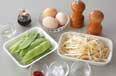 フライパンにサラダ油を入れて強火で熱し、しっかり水切りしたオランダ豆、モヤシを炒め合わせる。