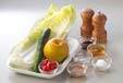 白菜、キュウリ、梨をサッと混ぜ合わせて器に盛り、よく混ぜ合わせた<ドレッシング>を掛け、プチトマトを散らせる。