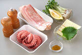 ゆでタコ足は1本ずつに切り離して足先を少し切り落とす。大きな足4本は半分の長さに切る。冷水で洗って水気を拭き取り、塩コショウをする。ベーコンは半分の長さに、スライスチーズは4等分に切る。大葉は縦半分に切る。貝われ菜は根元を切り落として水洗いし、水気をきる。
