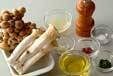 エリンギは、半分の長さに切って縦6~8つに裂く。エノキの場合は根元を切り落とし、半分の長さに切って、根元はほぐしておく。