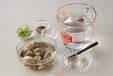 貝(ここではアサリを使っています)は薄い塩水につけて砂抜きをし、殻と殻をこすり合わせて洗い、ザルに上げる。