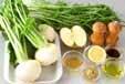カブは葉が付いているものは葉を切り落とし、皮をむいて縦2~4つに切り、薄い半月又はイチョウ切りにする。