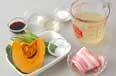鍋にだし汁、<調味料>、カボチャ、ベーコンを入れて、落とし蓋をし、更に鍋の蓋をして強火にかける。煮立てば火を弱め、13分煮る。