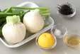 カブの葉、1/3個分はきれいに洗い、塩少々を入れた熱湯でサッとゆでて水に取り、粗熱が取れれば水気を絞り、1cmの長さに切る。
