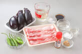 ナスはヘタを切り落とし、ピーラーで所々縦しまに皮をむいて斜め乱切りにし、塩水につける。シシトウは軸を切り落とし、斜め半分に切る。豚バラ肉は4cmの長さに切る。ショウガは皮をむき、せん切りにする。