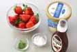 イチゴは水洗いして水気を拭き、ヘタを取り、縦半分に切る。