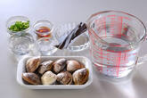 鍋に水、貝、昆布を入れて弱めの中火にかけ、煮立つ直前に昆布を取り出してアクを取る。