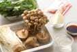 エノキは水洗いし、根元を切り落として半分の長さに切り、根元は食べやすい束にさばく。