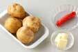 ジャガイモは皮ごときれいに水洗いし、1個ずつラップに包んで電子レンジで6~7分、途中向きを代えて加熱する。竹串を刺してみてスッと刺さればOK、堅ければもう少し加熱して下さい。