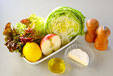 器にレタス、サニーレタス、カマンベールチーズ、リンゴを盛り合わせ、食べる直前に<ドレッシング>を掛ける。