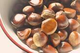 栗はかぶる位の水と一緒に鍋に入れて強火にかけ、煮たったら弱火にして鍋に蓋をし、10~15分蒸しゆでしてザルに上げる。