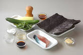 のりの片面にゴマ油を塗り、塩をふりかけ、両面軽くガス火であぶり、4等分に切る。残り野菜はスティック状に切り、冷水につけてパリッとさせ、大葉やレタスは冷水で洗う。どちらもしっかり水気を切っておく。