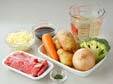 肉の色が変われば、ジャガイモ、玉ネギを加えて炒め合わせ、全体に油が回れば、具がひたひたにつかる位のだし汁を加える。