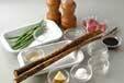 <調味料>のショウガは皮をむきせん切りにする。