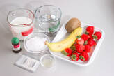 (2)を食べやすい大きさに切り、フルーツ、<シロップ>と共に器に盛り合わせる。