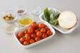 <ドレッシング>にプチトマト、玉ネギ、バジルの葉、オリーブを混ぜ合わせ、食べる直前までつけておく。