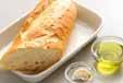 温めておいたオーブントースターでフランスパンを軽く焼き、ニンニクの切り口をパンにこすりつけて香りを付ける。