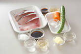 器にブリを盛り、タレを掛ける。汁気を軽く絞った<野菜の甘酢漬け>を添える。