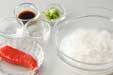 明太子は薄皮に切り込みを入れ、中身を出しておく。