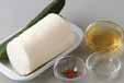 キュウリは両端を切り落とし、皮を縦縞にピーラー等でむき、一口大の乱切りにする。