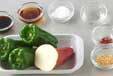 ピーマンは縦半分に切ってヘタと種を取り、縦に細切りにする。