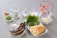 混ぜ合わせたエビと<調味料>を8等分に分ける