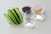 オクラは板ずりして(まな板にオクラを並べて塩を掛け、手の平で転がすようにオクラの繊毛を取る)、熱湯に塩ごと入れてゆでて水に取る。粗熱が取れれば、ガクを切り落とし、長さを2~3等分に切る。