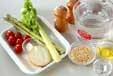 プチトマトは水洗いし、ヘタを取って縦4つに切る。