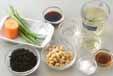 鍋にゴマ油を中火で熱し、ヒジキ、ニンジンを加え、炒めあわせる。