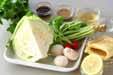 器に油揚げ、キャベツ、ミツバ、マッシュルーム、ラディッシュを盛り合わせ、<合わせダレ>をかけていただく。
